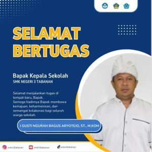 Pada hari Senin, 26 Mei 2025, telah dilaksanakan serah terima jabatan Kepala SMK Negeri 3 Tabanan dari Bpk. Plt. I Wayan Sudarsana, S.Pd., M.Pd., kepada Bpk. I Gusti Ngurah Bagus Aryotejo, ST., M.Kom. Disaksikan oleh Pendamping Satuan Pendidikan SMK Prov. Bali, Bpk. I Wayan Hadi Suartana, S.Kom., dan Ketua Komite SMKN 3 Tabanan, Bpk. I Wayan Gunadi, S. Sos. Yang dihadiri oleh seluruh Guru dan Tenaga Kependidikan SMKN 3 Tabanan.